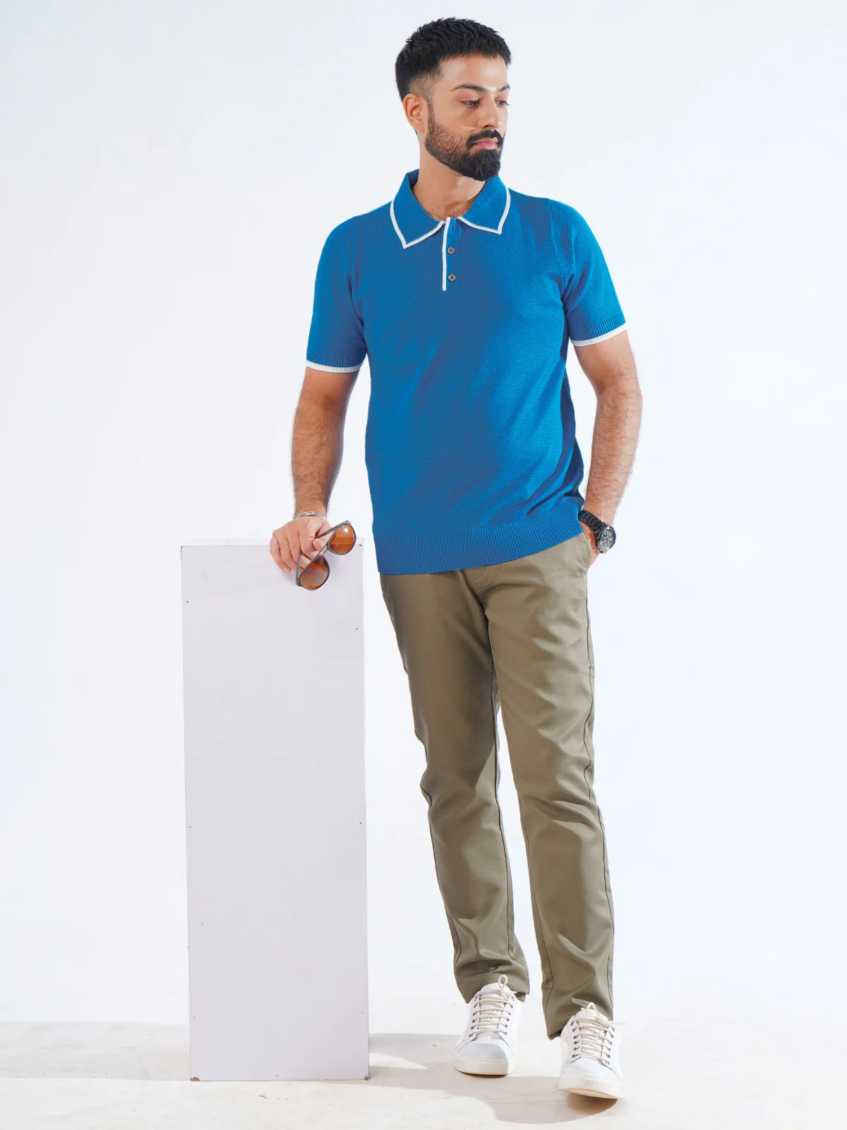 Blue Contrast Collar Half Sleeves Premium Knitted Popcorn Polo T-Shirt (POLO-846)