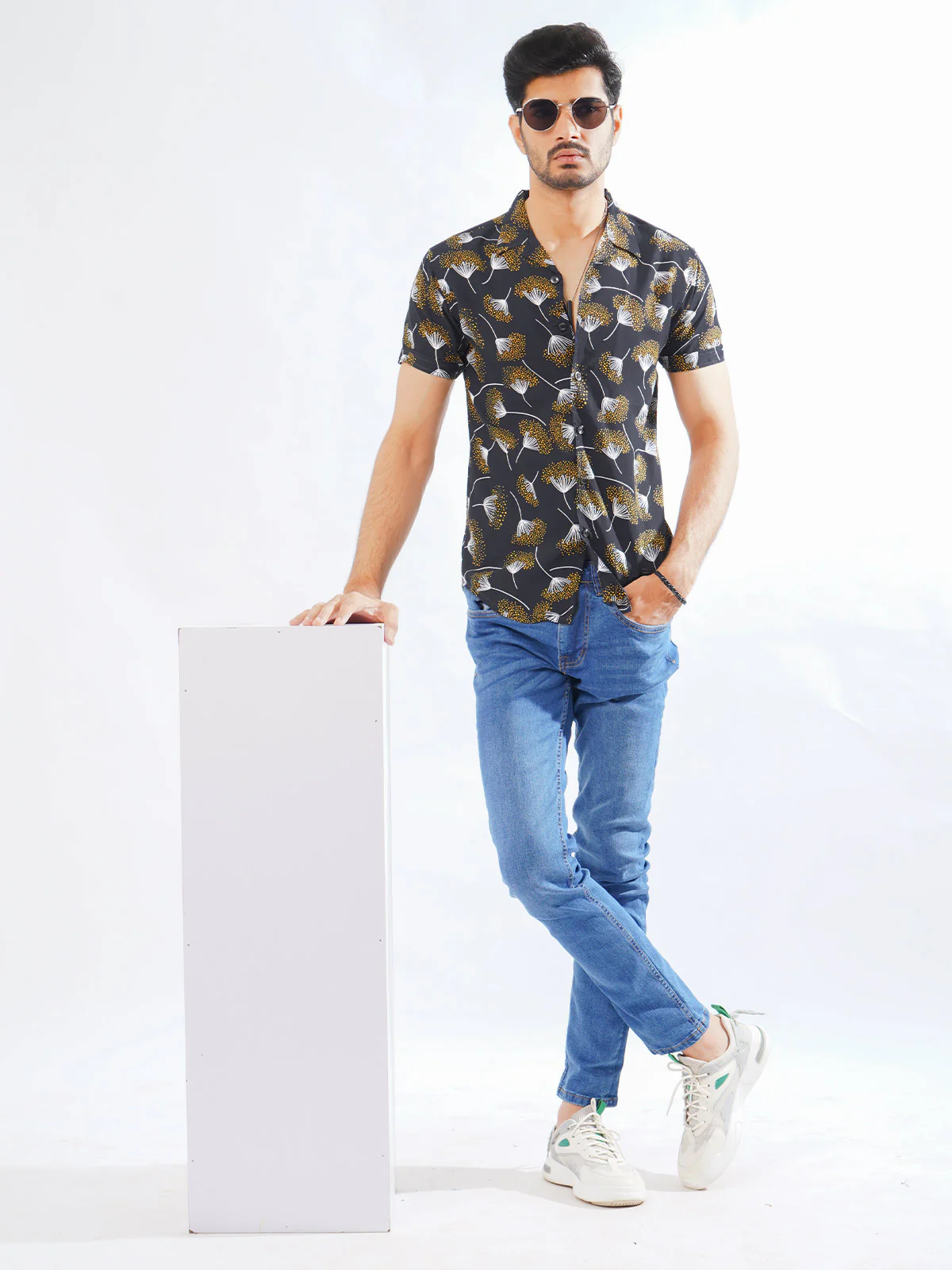 Dark Blue & Yellow Flower Printed Half Sleeves Casual Shirt (CSP-278)