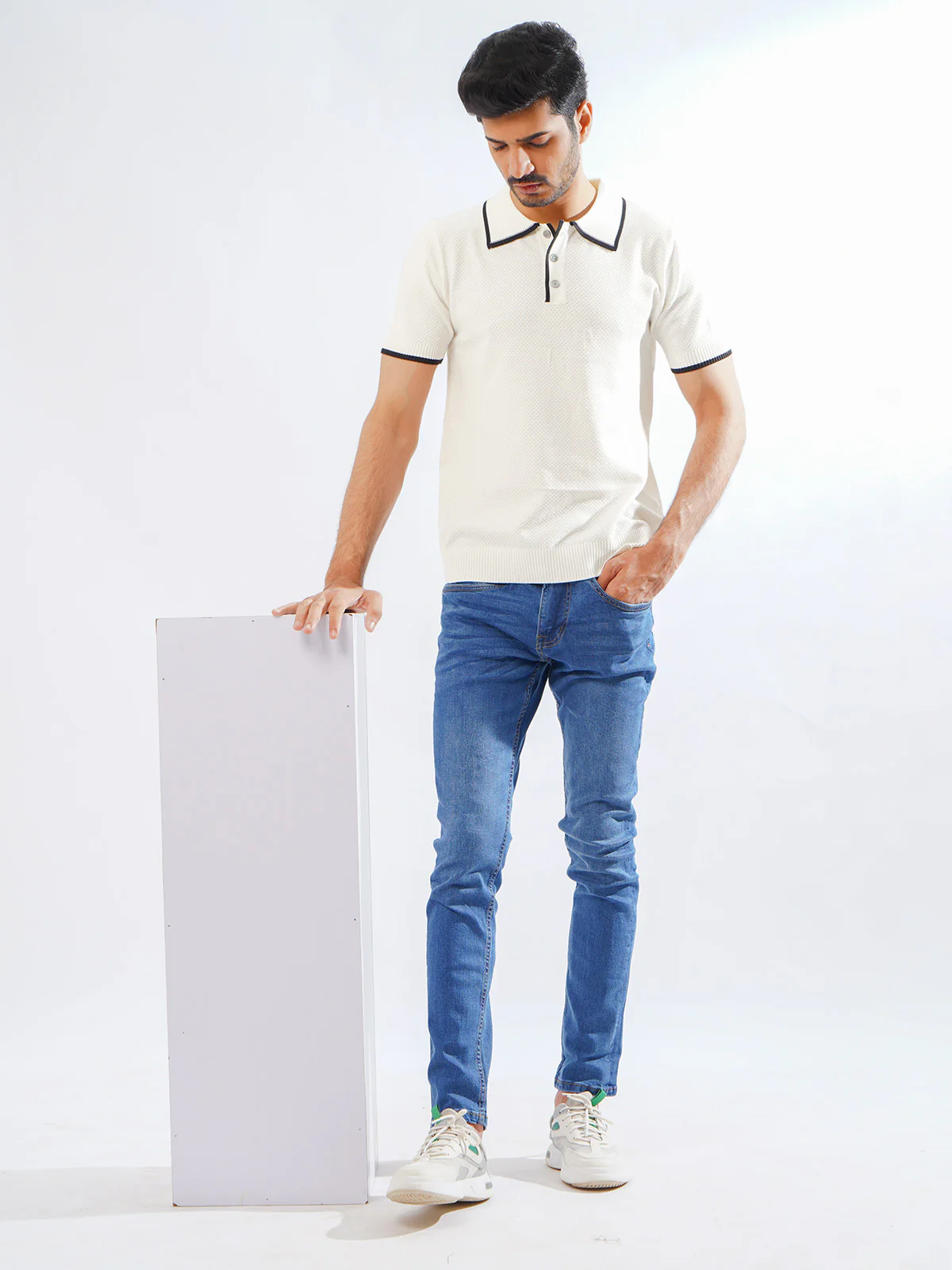 Off White Contrast Tipping Half Sleeves Designer Knitted Polo T-Shirt (POLO-788)