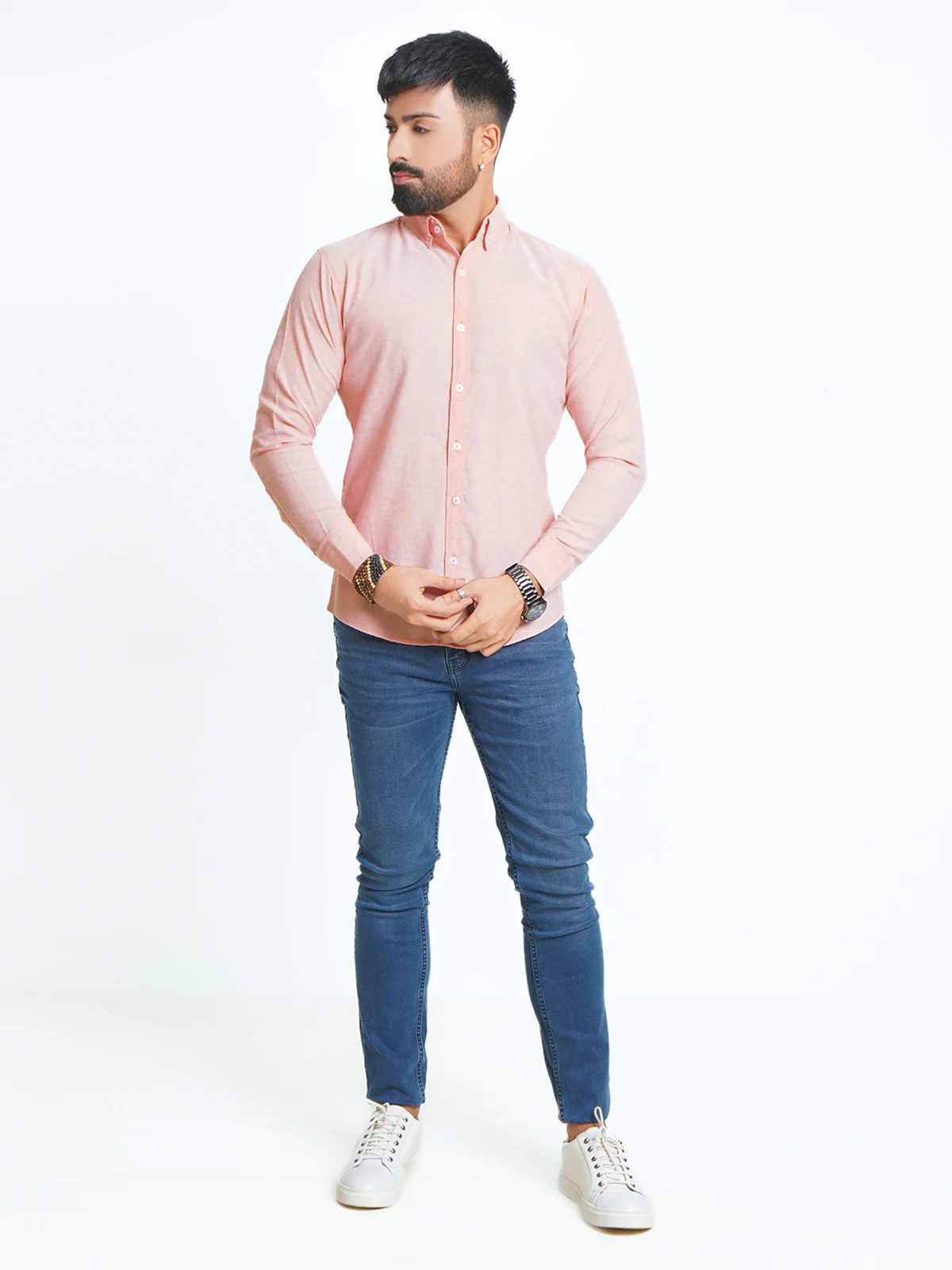 Stay stylish and comfortable with our Peach Self Button Down Casual Shirt (CSB-133). Crafted with premium quality 70% cotton and 30% polyester, this shirt features a button-down collar and full sleeves with round cuff. Perfect for all seasons, this ready to wear shirt is a versatile addition to your wardrobe.